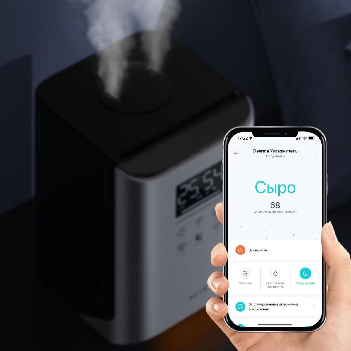 - Мобильное приложение: Дистанционное управление со смартфона — выбирайте режимы, настраивайте таймер и контролируйте влажность из любой точки дома.