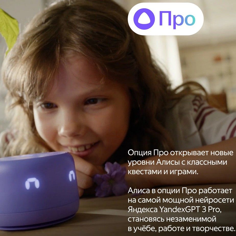 Алиса работает с нейросетью YandexGPT и всегда готова придумать самые смелые, весёлые и креативные идеи, объяснить сложное простыми словами и просто поддержать диалог. А если подключить опцию Алиса Про, у детей появится множество развивающих игр и квестов, а у родителей — возможность тратить больше свободного времени на себя.