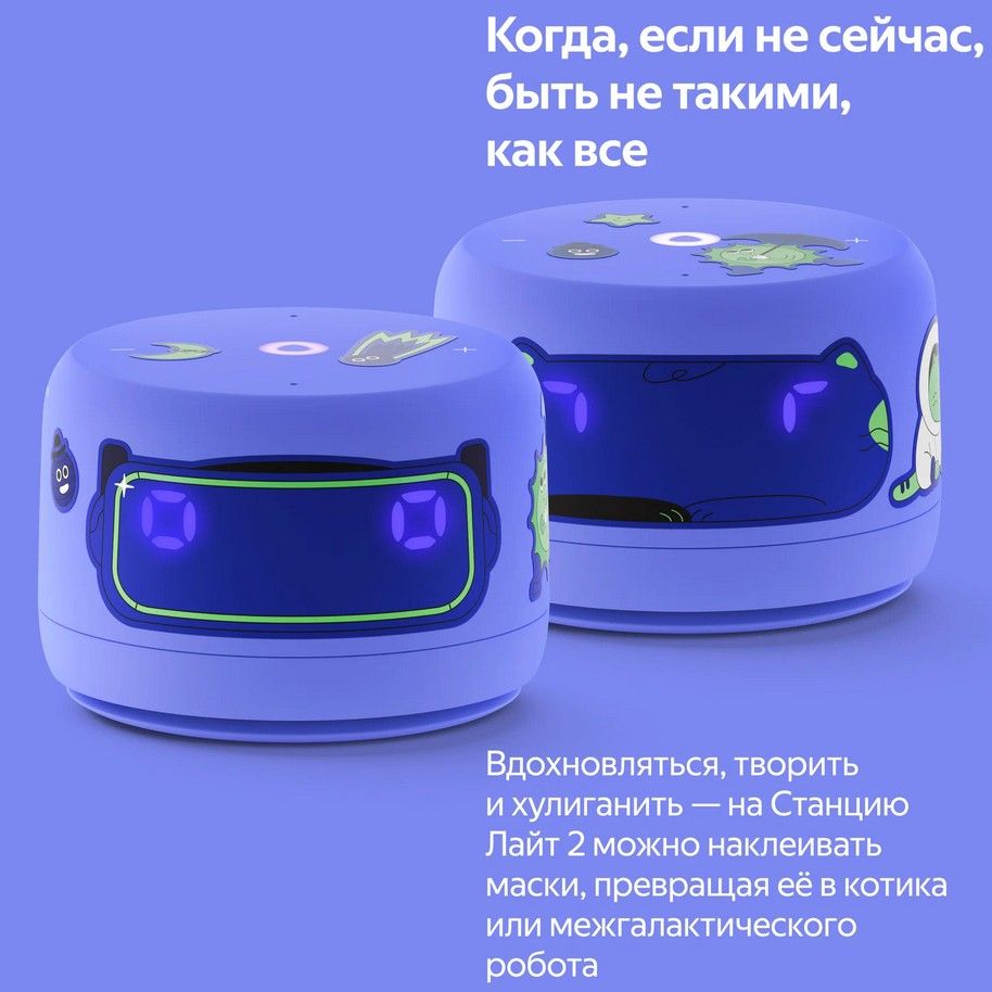 Со Станцией Лайт 2 дети могут играть, хулиганить и превращать умную колонку в необычных персонажей. Например, можно наклеить на колонку маску котика или межгалактического робота. А стикерами из набора здорово украшать и умную колонку, и всё вокруг.