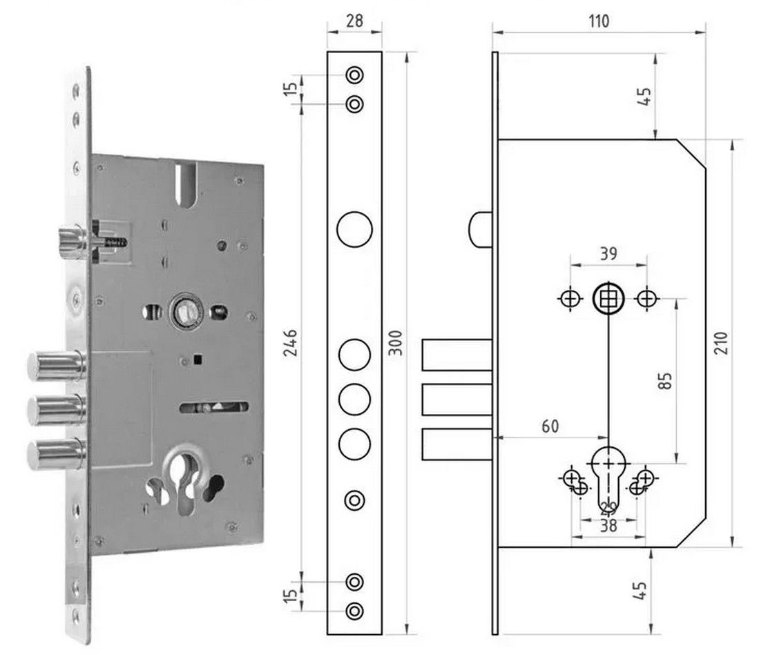 - Управление ригелем: Нажатием/поднятием ручки и поворотом цилиндрового механизма